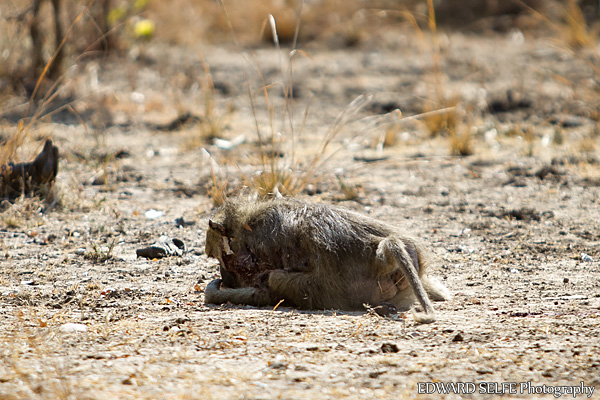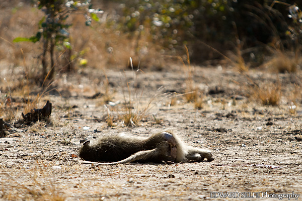 We turned our attention to the baboon which was still alive and struggling in the sun. We suspected that the leopard would return to claim her prize, but there were still a large number of baboons around, some ‘guarding’ their colleague closely.