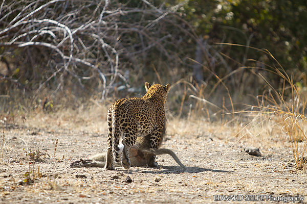 But the leopard was fast and she caught up with the baboon and took it by the scruff of the neck. As she turned to carry it back to the bush where she had been hiding (with her cubs) the baboons surrounded her, coming as close as they dared. (I didn’t manage to photograph these moments, as I was moving the vehicle out from behind a bush to get a better view.)