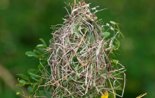 Spectacled Weavers are one of many species in the Ploceus genus, which are generally yellow in colour and build beautiful woven nests out of fresh grass. This female Spectacled Weaver is inspecting the nest which the male is constructing. When she's happy with it, she'll 'make home' inside with some soft grasses and leaves and begin nesting. However, this nest still has a fair amount of work to be done, so perhaps she was just checking [...]