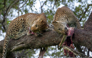 It's not often that you find leopards together since they're generally solitary creatures. The only exceptions are when a pair come together to mate, or a mother is rearing cubs. In fast fading light, I found this mother and male cub feeding together on the remains of an impala that they had killed in the morning. The image quality is very bad as it was almost dark, and there were lots of branches in the way [...]