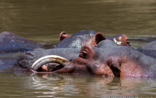 Sometimes the teeth of hippos don't form in the normal way, and the canine pierces the lip as it grows. While it looks horrific, there are several hippos in a similar situation in the Luangwa and they don't seem to be affected by it.