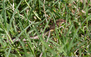 It always pays to take care where you tread out here. Quite apart from being a shame to squash this baby Boomslang, it might bite back. Boomslangs are readily identifiable by the enormous eye and the way in which the boundary between the upper and lower body colours always passes straight through that eye. While highly venomous, they are usually placid and rarely attempt to bite, preferring to slip away and up into the trees.