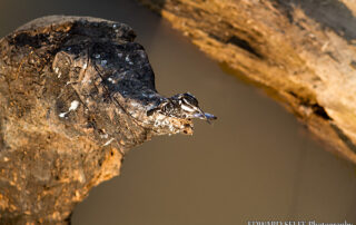 We don't often get very close to Kingfishers, because they have great eyesight and see us coming! However, when I was crossing the bridge recently, I stopped to have a look over the edge and saw this Pied Kingfisher with a fish in its beak! The perspective from above is a bit unusual but makes for an interesting photo.