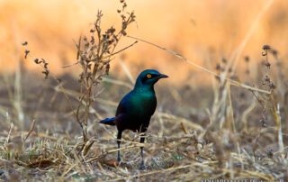 These Greater Blue-eared Starlings are ant and termite specialists, often found on the ground in short grass areas. Their iridescent blue/green colouration comes not from a pigment but from the micro-structure of the keratin in the feathers.