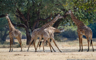 Giraffes spar by using their long necks and massive heads to inflict heavy blows on the body and legs of their adversary. We rarely see this fighting 'for real', as most animals prefer to settle their differences in other ways. But we often see sub-adult males practicing on each other so they learn the skills that they will need in later life to fight for dominance and the right to mate. When performed 'gently' this activity [...]