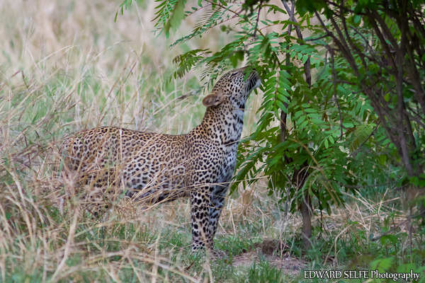 We know this cub, and we know that he’s still fairly dependent on his mother for food, although he will certainly be killing small prey on his own too. In this case, he was well fed and seemed to be bored more than anything else. He had no intention of hunting and as a youngster had no territorial duties to perform, so he just moved around the area sniffing bushes for scents. At one point he became very interested in a particular bush and repeatedly scented the leaves. We suspected that this bush is a regular scent-marking point for the resident male leopard who we see in that area. We think that the male is this cub’s father, but we never saw the mother mating, so we can’t be sure.