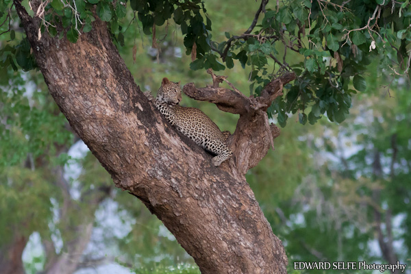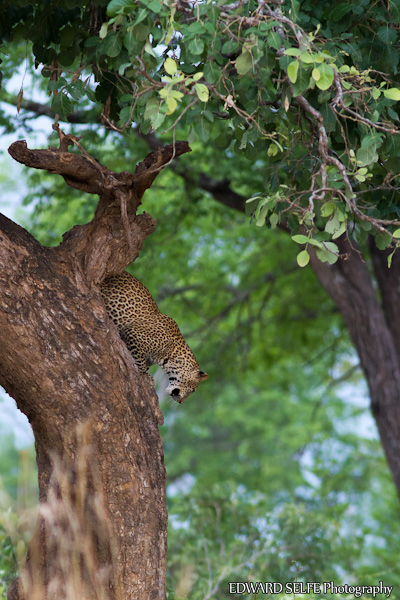 While we were waiting for him to show up again, I heard the distant call of a bigger leopard which I assumed to be the male. We went in search of him and found him soon after. He doubled-back when he saw us and headed towards where the cub had been. We followed to find out if there would be any aggression between the two, but the cub had (wisely) disappeared by the time the big male arrived. Interestingly a number of hyaenas had congregated near where the cub had been (if there was a kill nearby, we hadn’t been able to find it) and the large male leopard ran right into them. Thinking that he would simply ignore the hyaenas, as I have seen leopards do so many times before, I was surprised to see him snarl and then run straight up the trunk of a nearby tree! Soon the hyaenas realised that he had nothing that they wanted, and moved off. The male came down very rapidly and disappeared.