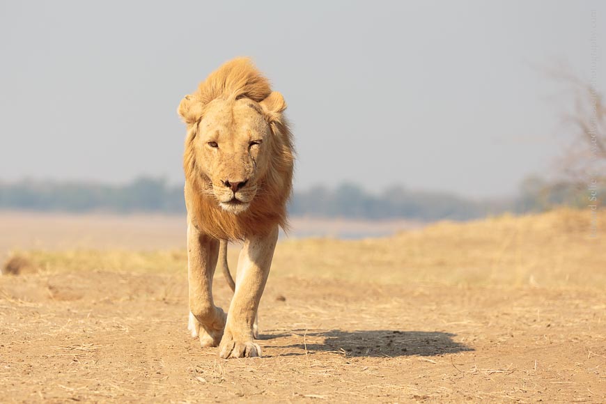 From where we were watching the elephants, we spotted some lions hidden in the bushes on the banks of the river. They were well-concealed from view, but I knew that the sun was getting hot and they would eventually get up and move to the shade. We were very lucky because one of the males – known to us as Ginger (can you guess why!?) – finally yawned, rolled and then walked out of the bushes and right towards us!