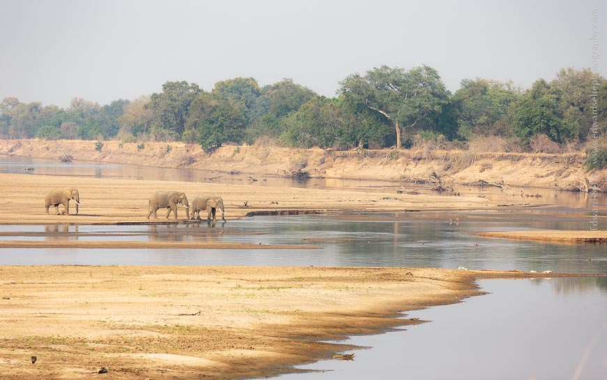Just after entering the park on the first morning, we spotted some elephants heading to the water. They were either going to cross the river or have a drink (or both!) so we waited for them to reach the edge. The drying Luangwa River bed is very scenic at this time of year, and provides a magic background for photos.