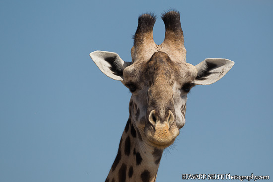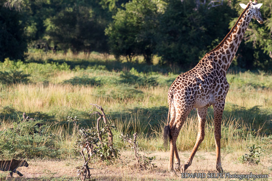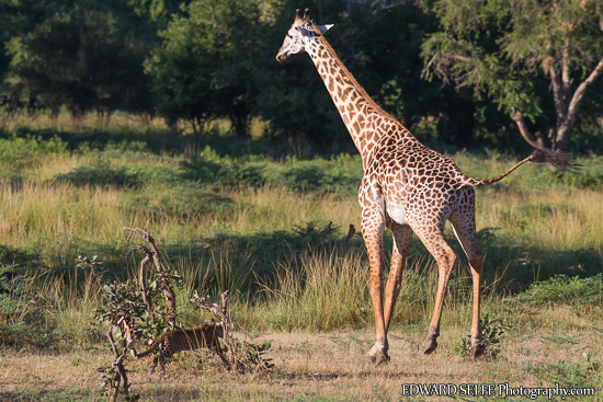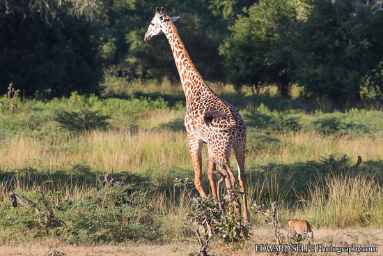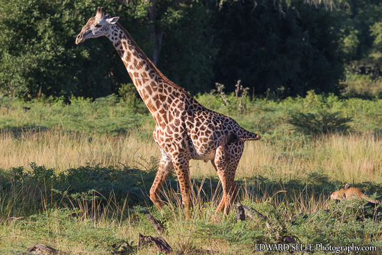 The leopard wasn’t really hunting the giraffe, as prey such as a giraffe is clearly much too large, but she was certainly practicing stalking her larger friend, and at one point, we thought she would jump on the giraffe’s back! The whole performance (stalk, chase, retreat) was repeated several times before the young cat became bored and wandered off, leaving us to consider the astonishing markings on the flank of one of the old males.