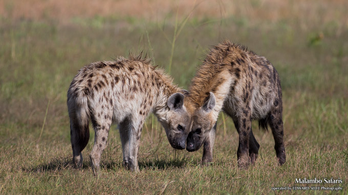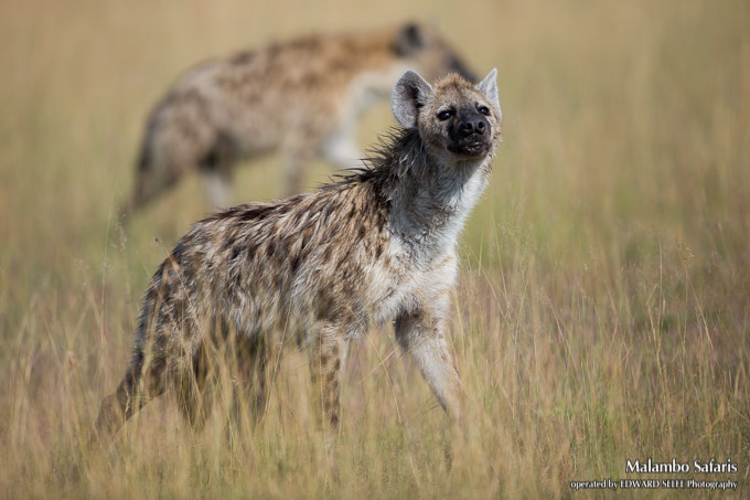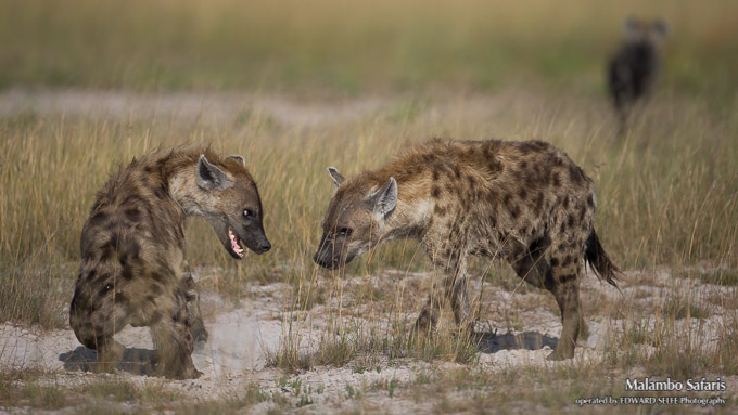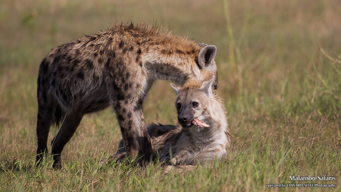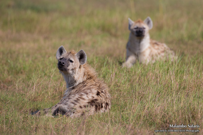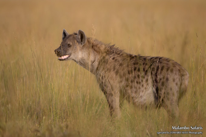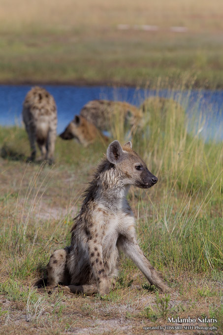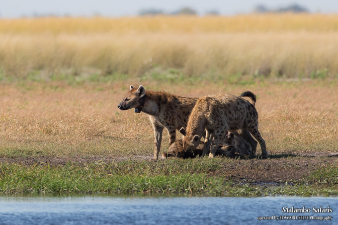 Spotting hyaenas on the way there, we approached and found a den site belonging to the Miyumi Clan, not the clan that we had been heading for. One large hyaena was wandering in the grass, and another (much older individual) was resting on top of the mound, surveying the area and keeping the den site safe.
