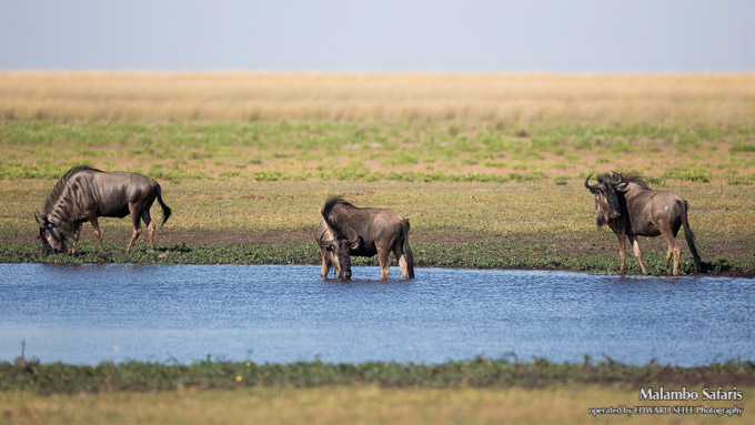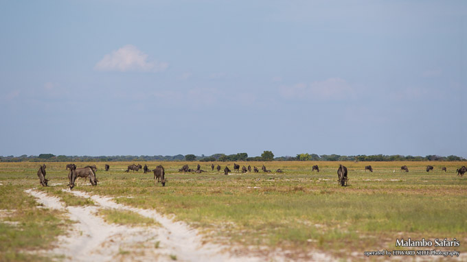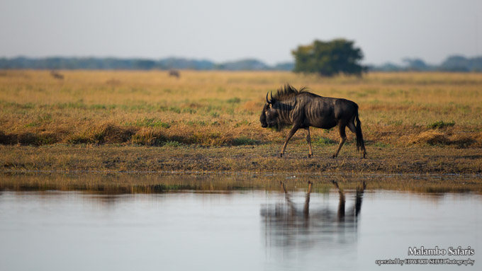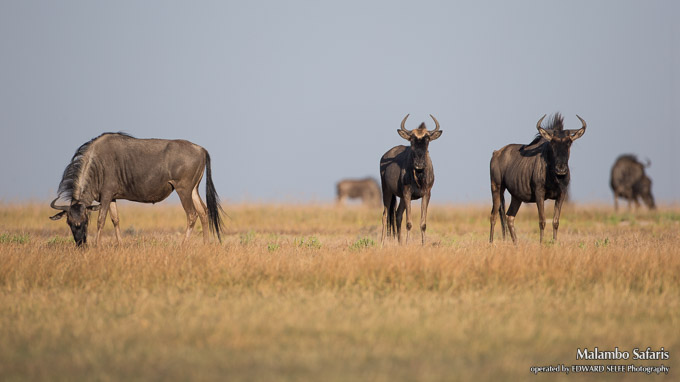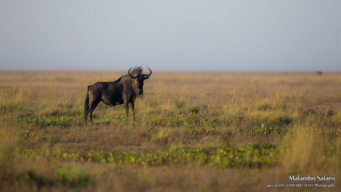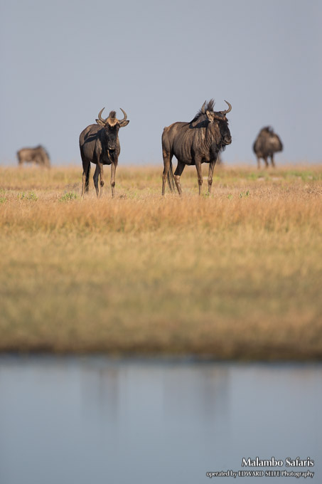 We landed at the airstrip in Kalabo and began a 2 hour drive through the mushitu scrub towards the plains. The arrival of the grassland happens quite suddenly – presumably at the high-point of the flood waters – and the effect is quite striking. As far as the eye can see, there is golden-topped Laudatia grassland, speckled with endless meandering wildebeest mowing the short grasses.