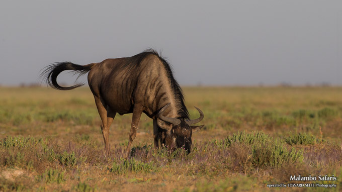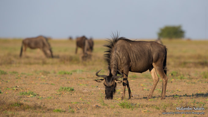Having had such success with the hyaenas the previous two days, we decided to start out the following morning with the plan to photograph the large herds of wildebeest that roam the plains. In May, the only area of the park that has any short grass is around NCs’s Matamanene Camp, so the whole population is centred here. But taking photos that portray the vastness of the plains, and the huge numbers of herbivores is hard; wide-angle lenses, which would seem the obvious choice, lead to everything being very small in the frame and the wildebeest are lost. Mid-length lenses are better and I have some shots a 200mm, but it’s hard to separate the wildebeest in the foreground from those in the background. So I opted to use my longest lens and see if I could create a nice composition, showing a proud wildebeest bull in the foreground with others in the distance making up the frame.