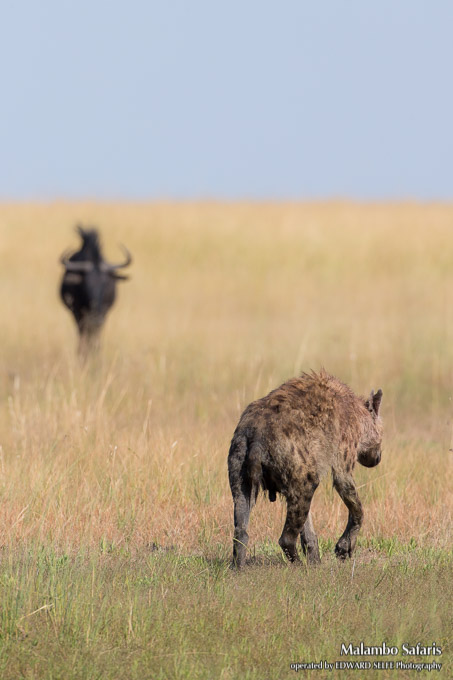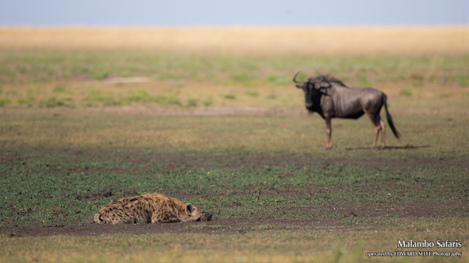 Heading to one of the waterholes with the wildebeest, we found a lone hyaena resting in the soft mud. With little shade around, these predators make use of the water to keep cool in the heat of the day. As you can see, the wildebeest know that they are not a threat in daytime and certainly not when they are alone, so they pass each other with barely a glance.