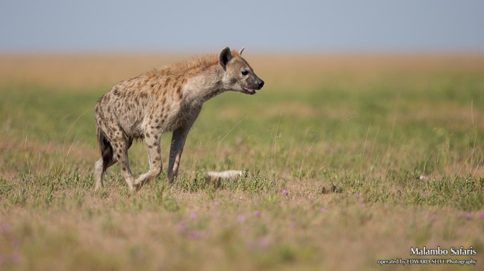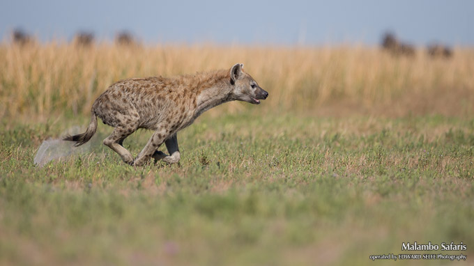 While we were sitting there, we spotted two hyaenas running across the plain. We followed them, and then got ahead to see where they were going. We never worked it out, but took some photos as one ran towards us.