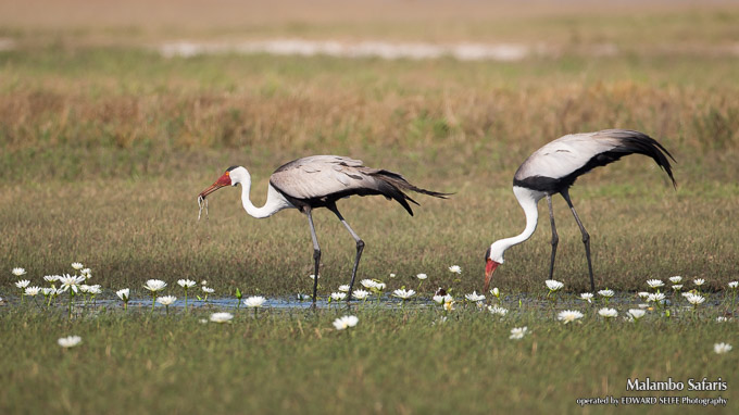 We were heading for a lagoon which we knew was topped with lots of beautiful water lilies. I was very pleased to find that two Wattled Cranes were feeding in the shallows. We approached carefully as these birds are hugely shy and managed to get close enough before they moved off.