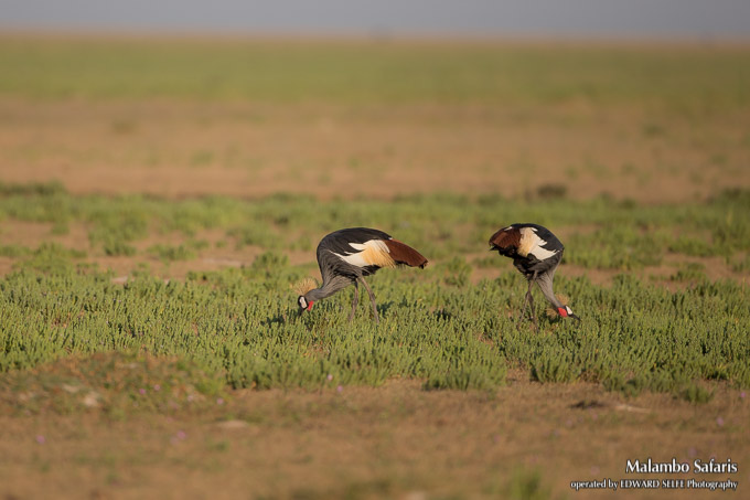 Arriving on the plains, I began my mission with the wildebeest. Initially, it didn’t go so well as all the bulls were shy and ran from us whenever we stopped the vehicle. I quickly realised that the wind was blowing from behind us and carrying our scent onto the animals. We took a sharp turn and headed into wind and the problem was solved! Over the coming morning, we had some nice sightings including this bull who swished flies with his tail, and a pair of Crowned Cranes foraging in the forbs.