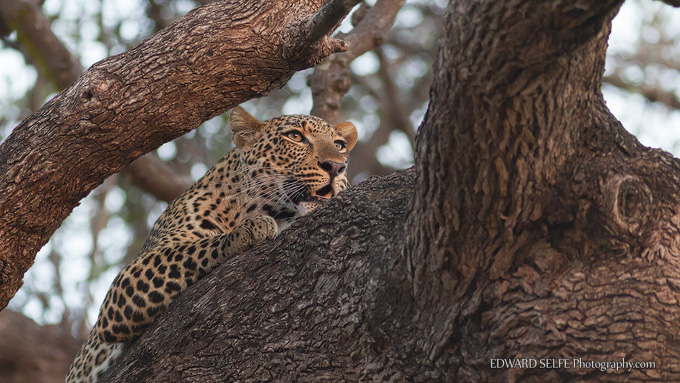 I was lucky recently to find a leopard hidden in a tree early in the afternoon. She was very sleepy and had a full belly so we knew she wouldn’t go far until it got nearly dark. We continued our drive and returned to the area as it was cooling down.