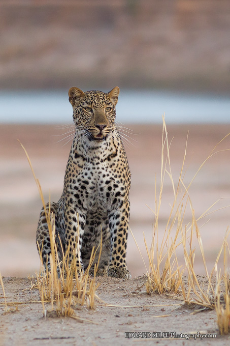 While watching elephants feeding on the sand, I saw a couple of antelopes raise their heads and look towards the steep river bank. Knowing that there was a small puddle of water there, I was sure that the leopard had come down from the tree to go for a drink. Indeed she had, and we drove over to find her just scaling the river bank once more. Seeing us, she stopped and posed for some time, contemplating where to go.