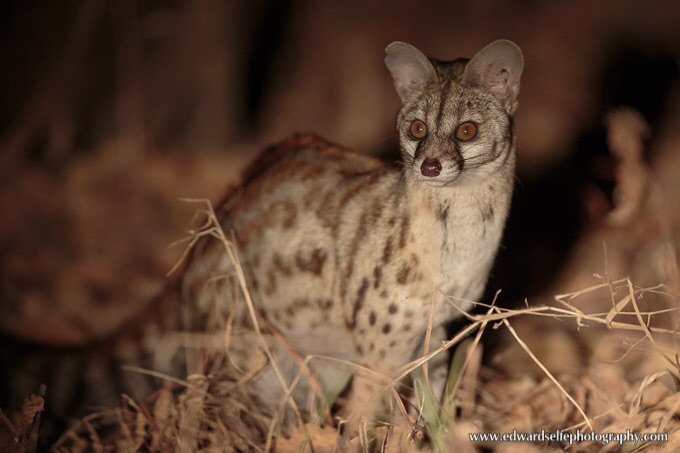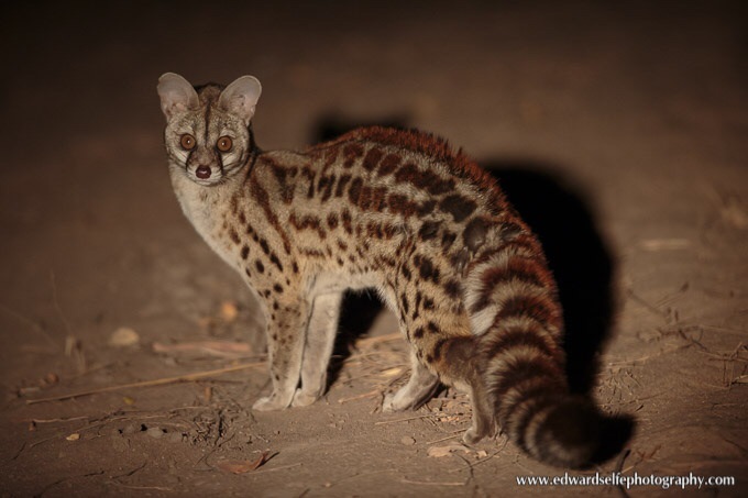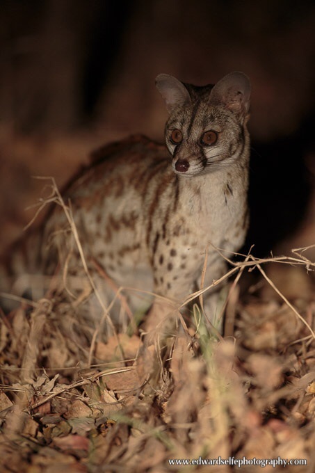 Returning to camp one evening, we had an extrodinary sighting of a large-spotted genet. Usually shy, the most often move away from the light and forage in the shade of a tree, using the shadow from the spotlight to hide. Not in this case; the genet approached our vehicle, appearing to follow the light and show interest in us as we watched. We kept the light nearby the genet but not on it, and eventually it came as close as 4m from the vehicle.