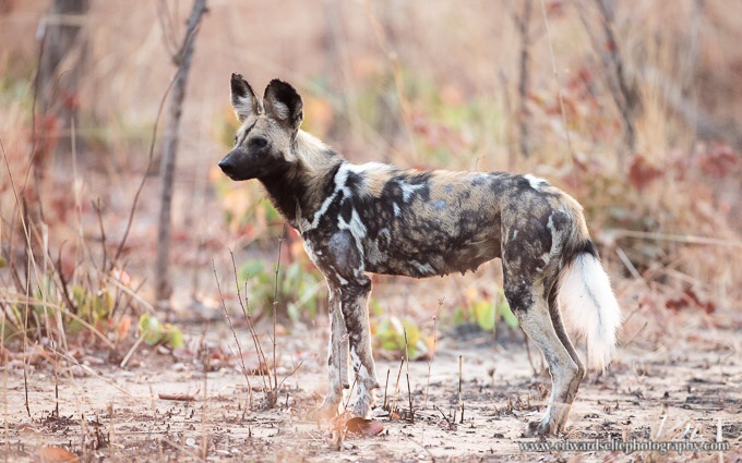 Fortunately, one of the dogs was momentarily backlit by the soft morning light and it all came together for a nice portrait. We followed them for a while longer but they moved off the road into the thickets where the chances of following them was almost nil.