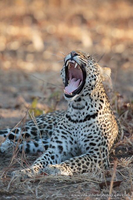 Crusing along the main gravel road through the park, we almost didn’t see this leopard resting at the side of the road. When they are lying still and you are focussed on missing potholes, their concealing camouflage is very effective. As in domestic cats, yawning is a sign of waking up, rather than getting tired and this leopard was beginning to move around as the heat dissipated out of the day.