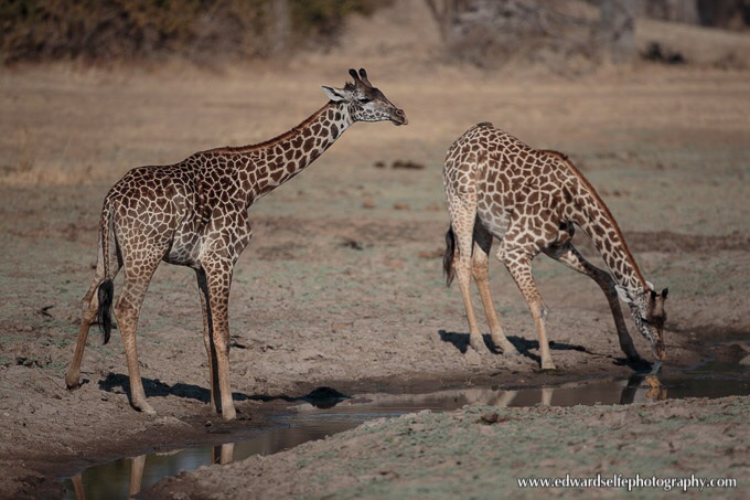 We were lucky to find a large number of giraffes milling around near a waterhole. Most were in the shade but a couple were enjoying a drink, performing their characteristic head-shake as they raise their necks after drinking.