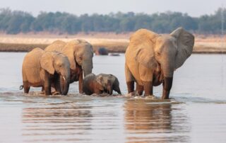 Early on our last morning, we found these two lionesses resting on the river bank. They had stalked and chased a warthog, but failing to catch it, they settled down to sleep. Their heads were kept up by the presence of 6 lions on the other bank of the river behind us. We waited over an hour for elephants to come to the river and cross. We were rewarded as this family met a crocodile mid-stream [...]