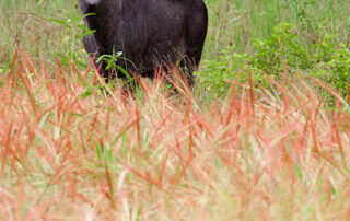 I came across this confident-looking male Waterbuck in the park a couple of days ago, and enjoyed the contrast of his dark coat against the red topped grass.