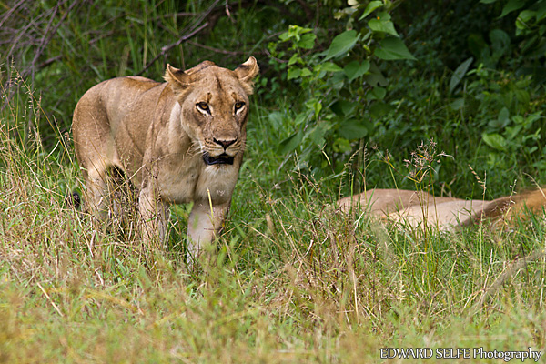 We could hear cubs calling from the thickets behind the pride, but they never showed themselves. Nevertheless, this female got up at the sound of the the cubs’ yelping and paced around. We left her them to rest, not wanting to disturb her if she had very small cubs nearby.