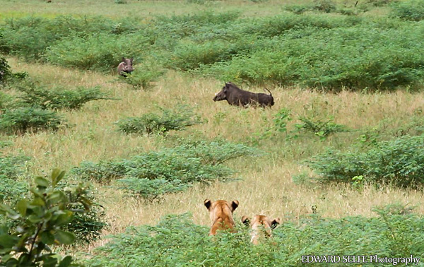 Over the weekend, I spent some time with a small pride of lions. Initially, they just lay in the sun, but later a couple of the females got up and began to stalk a pair of warthogs which were foraging nearby. The warthogs knew that something was going on even if they couldn’t see the lions, so they never strayed into striking range – I decided to try to video the event, rather than taking still photos, so I only have the following blurry image (which is a frame from the video).
