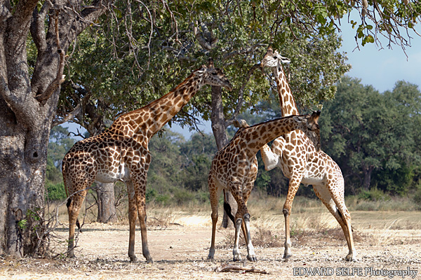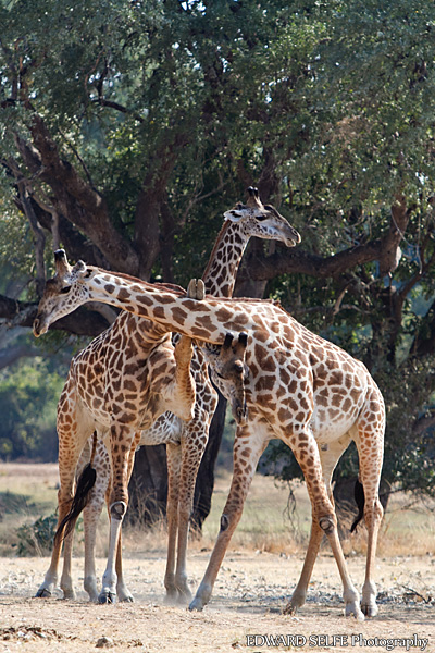Giraffes spar by using their long necks and massive heads to inflict heavy blows on the body and legs of their adversary. We rarely see this fighting ‘for real’, as most animals prefer to settle their differences in other ways. But we often see sub-adult males practicing on each other so they learn the skills that they will need in later life to fight for dominance and the right to mate. When performed ‘gently’ this activity becomes almost comic; one males hooks his head and horns under the leg of another and lifts, completely incapacitating the other!