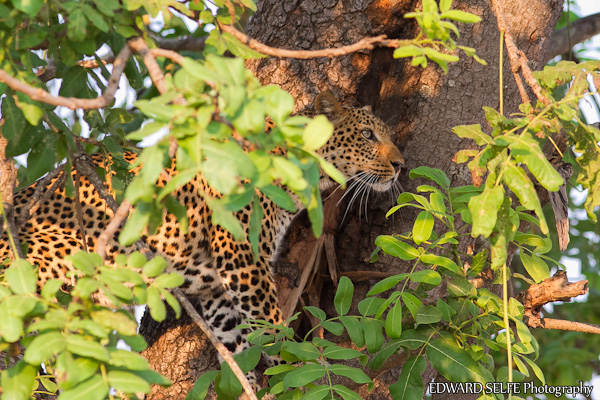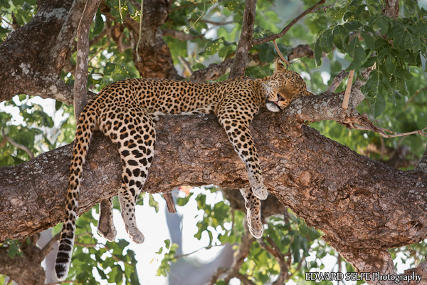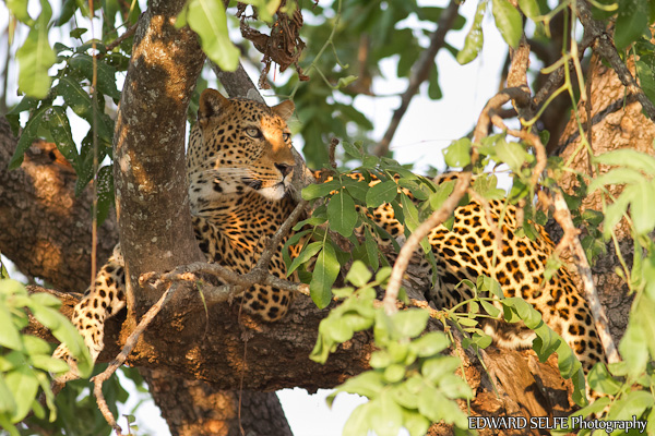 Leopards climb trees to escape the heat and the flies, and to stash their kill away from other predators such as hyaenas which would happily steal it from them. We found this female leopard up in a tree early in the morning.