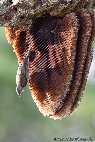 I found this Lesser Honeyguide feeding on an exposed bee-hive hanging from a tree branch. There were no bees in sight, but the reverse side of the nest was full of honey, so they must have only moved on very recently, perhaps because of a couple of nights of very heavy rain that we’ve had this week.