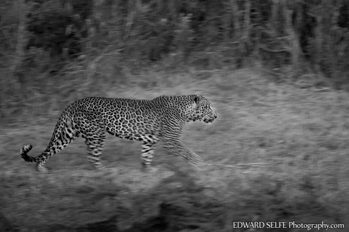 At the other end of the day, as the light was fading fast, we found a large male leopard padding through the shrubs at the edge of the river.