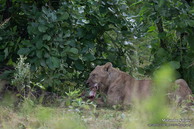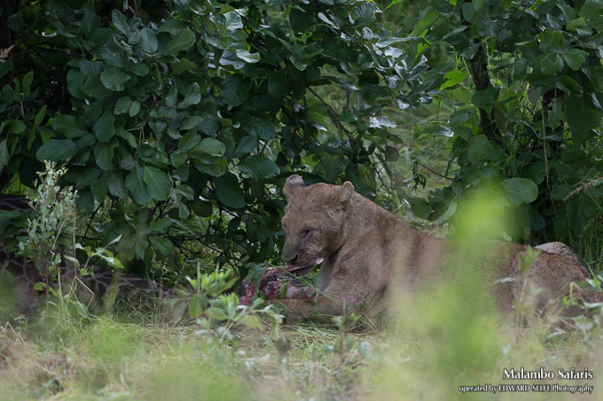 It was not surprise then, that on Saturday morning we found that the pride had killed a giraffe during the night, only 300 yards from our house. It’s not the first time that they’ve killed giraffe, choosing to chase youngsters up against a bank or other natural obstactle. In this case they had caught it in thick bushes at the bottom of the bank. When we went out to have a look, only one female was feeding on the carcass. The mother of the cubs had taken them away because they feel more vulnerable in daylight.