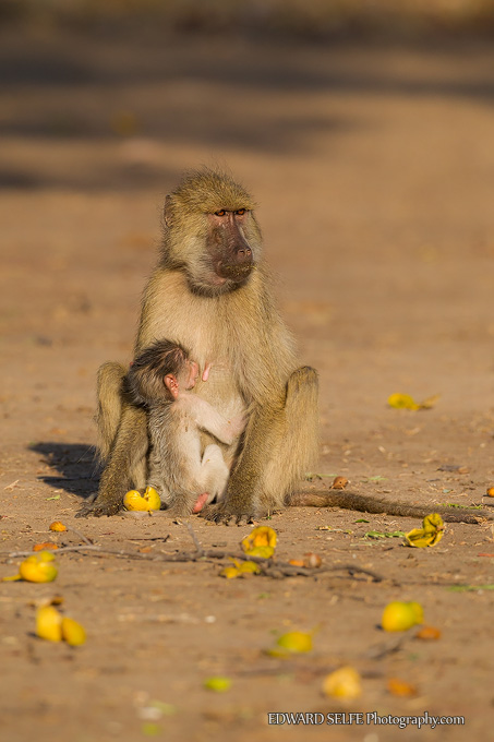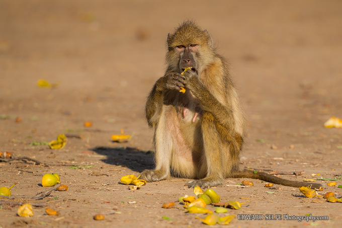 Here a troop of baboons feast on the abundant fruit on the ground before the elephants reach the tree.