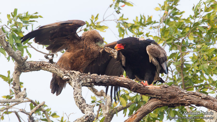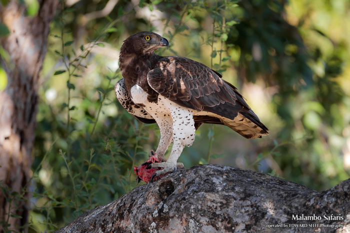 An epic sighting of a Martial Eagle feeding on a Guinea Fowl in a Rain Tree near the road. We watched from when the carcass was still fresh until there was very little left!