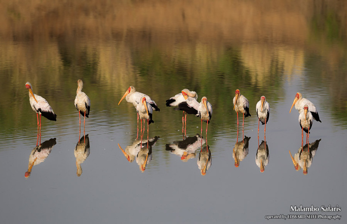 On a quiet morning in the bush, we stopped for a while with these Yellow-billed Storks, playing with different compositions. Clearly the reflection is important, but needed to be carefully considered where it conflicted with the reflection of the trees.