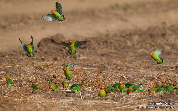 Lillian’s love-birds parachute to the ground in search of seeds.