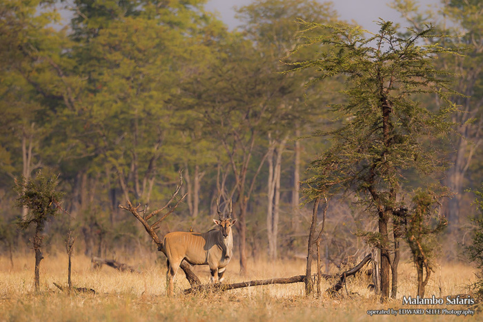 Eland are known to live in large numbers in the Nsefu Sector – in fact, Nsefu means ‘Eland’ in a local language – but they are often shy and especially the bulls are hard to photograph. Here a bull stood amongst broken woodland and allowed me an E-landscape….