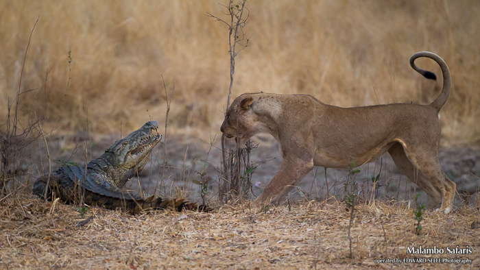 The lions having killed a buffalo nearby, the crocs decided to see if they could steal a bit. The lions had other ideas and saw them off pretty effectively!
