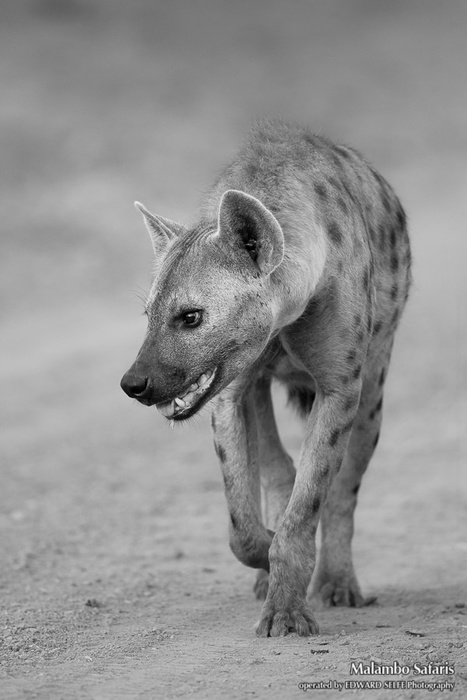 Out late in the morning, this hyaena was using the smooth road to travel to a resting place for the day.