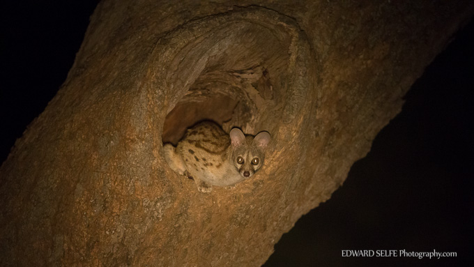 Heading back to camp after sunset (my 2 guests were not so interested in the night-time safari) we found a Large-spotted Genet appearing from a tree-hole.