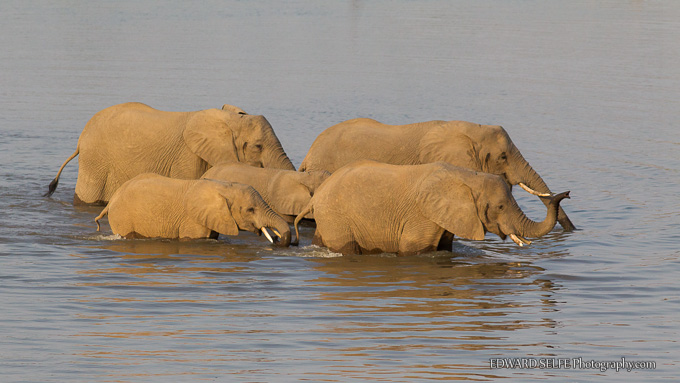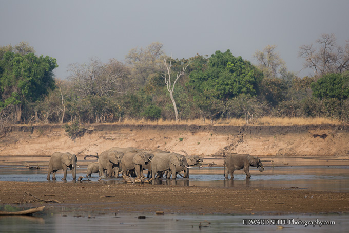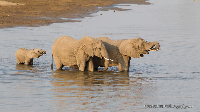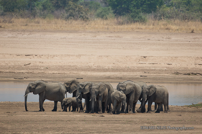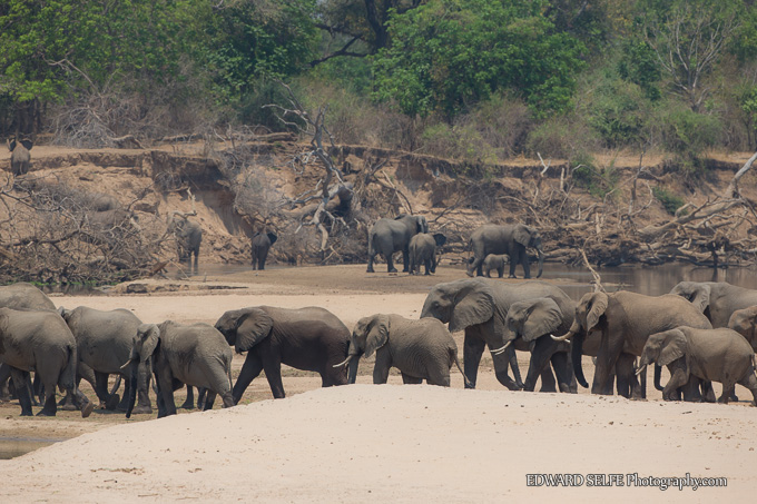 Close to camp, the elephants were having a convention in the river. We counted over 70 along a 200m stretch of river bank, many of the herds muddled together in a frenzy of greetings, bellows and tree-trunk legs. The light was harsh so we took a couple of ‘record photos’ and then just watched the display!