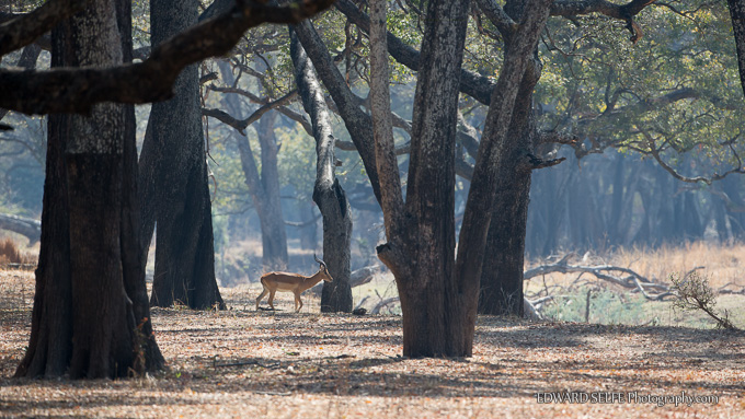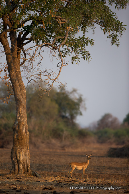 We had a great afternoon safari, heading to a more distant part of the park to look for the resident lion pride there. On the way, I saw an alert impala under a tall tree and saw a chance for a long-range animal-scape.