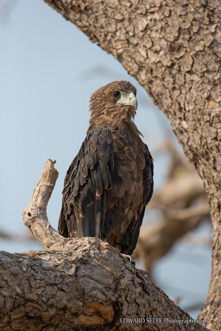 But there wasn’t much else that day, so we had some coffee and then started our journey back. Almost immediately, a Bateleur presented a nice portrait opportunity, sitting tight in a tree right by the road.