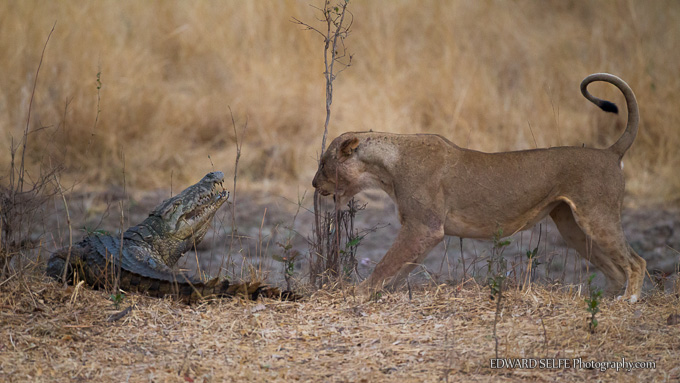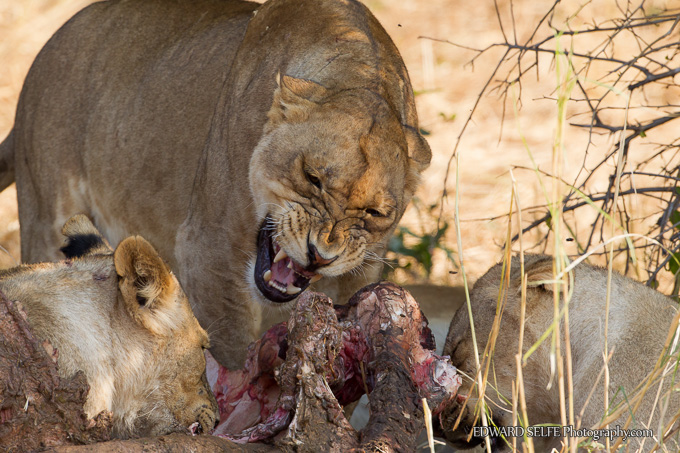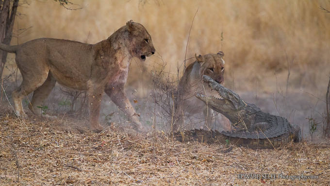 But as the light began to drop, crocodiles started to emerge from the water and head towards the carcass. The lions were having none of it though, and repelled the crocodile with a series of swipes and growls.