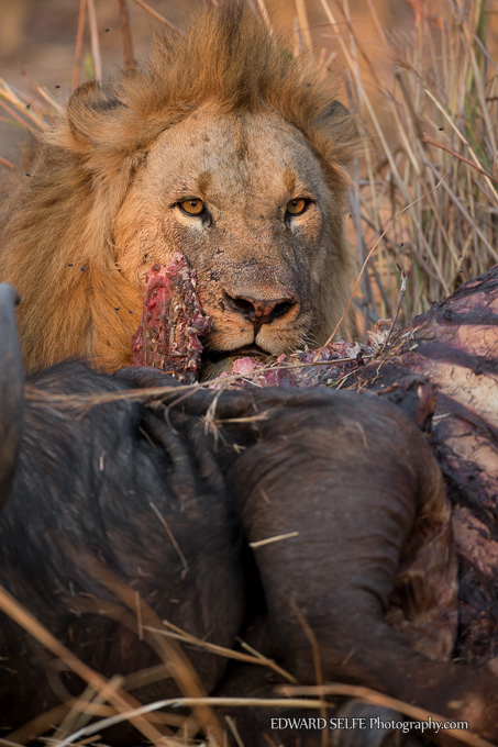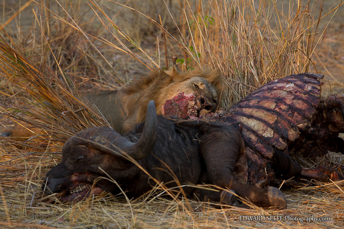 I quickly found a lionness who was returning from the water and led us to the pride’s kill in the long grass nearby.