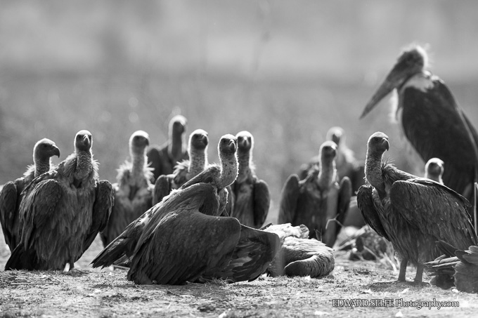 Following that, we drove for some time to catch up with a pride of lions which had killed an elephant the previous evening. We stopped off to photograph a juvenile Blacksmith Plover at a waterhole and then started to see the large numbers of Vultures that we knew would lead us to the kill.
